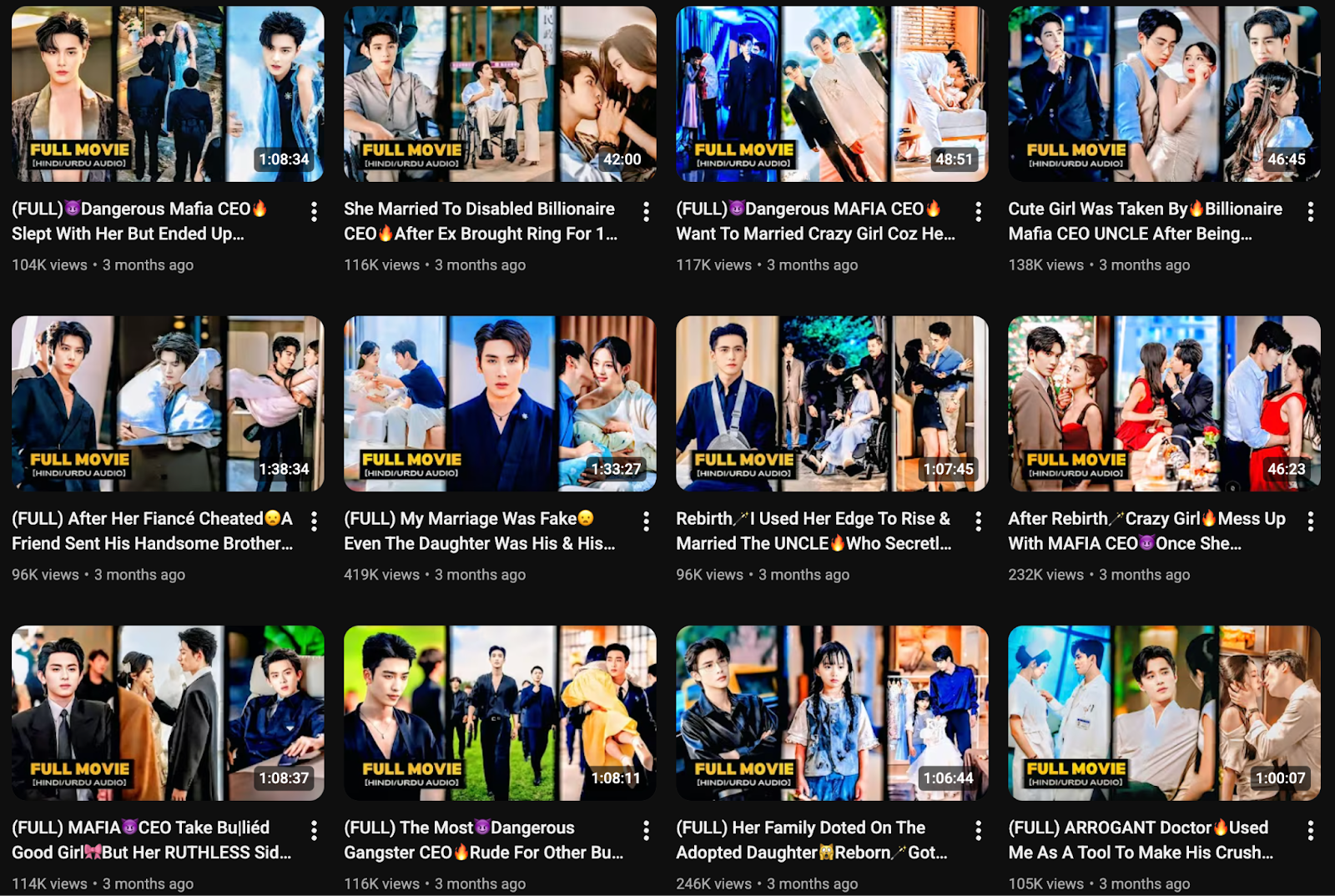 YouTube is blocked in China (though this isn’t strictly enforced). Still, for a taste of a popular Chinese export, consider the YouTube channel “Asian Drama Junction.” The channel has racked up nearly half a million subscribers, and millions of views, summarizing Chinese (and Korean) romance dramas in Hindi. There’s a theme to the fantasies.