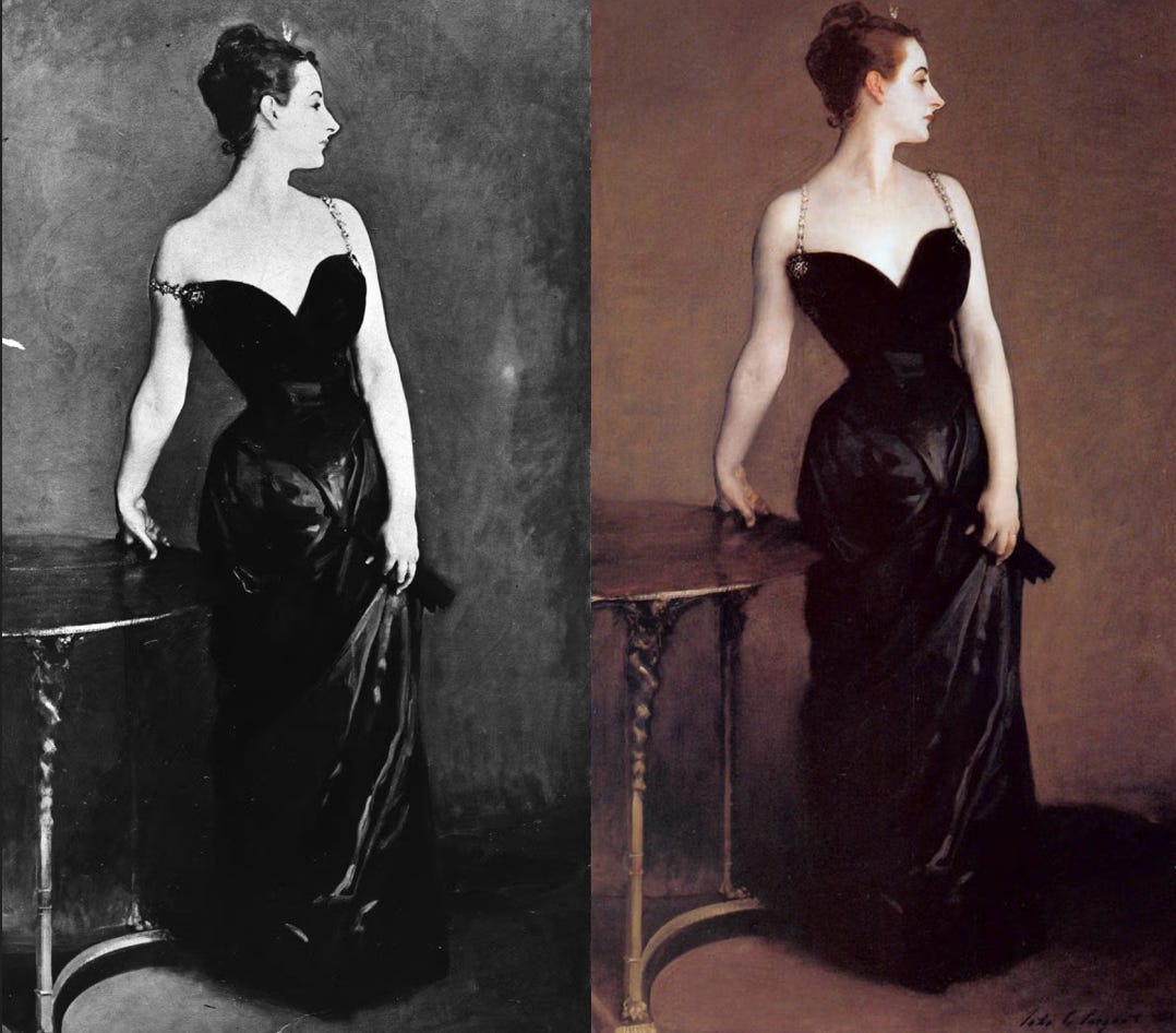 Modern women’s wear, the bikini included, takes this premise and runs away with it. To a self-defeating end, even — leaving nothing to the imagination is often less tantalizing than a strategically placed shoulder strap, as evidenced by the notorious 1884 John Singer Sargent portrait of Madame X.