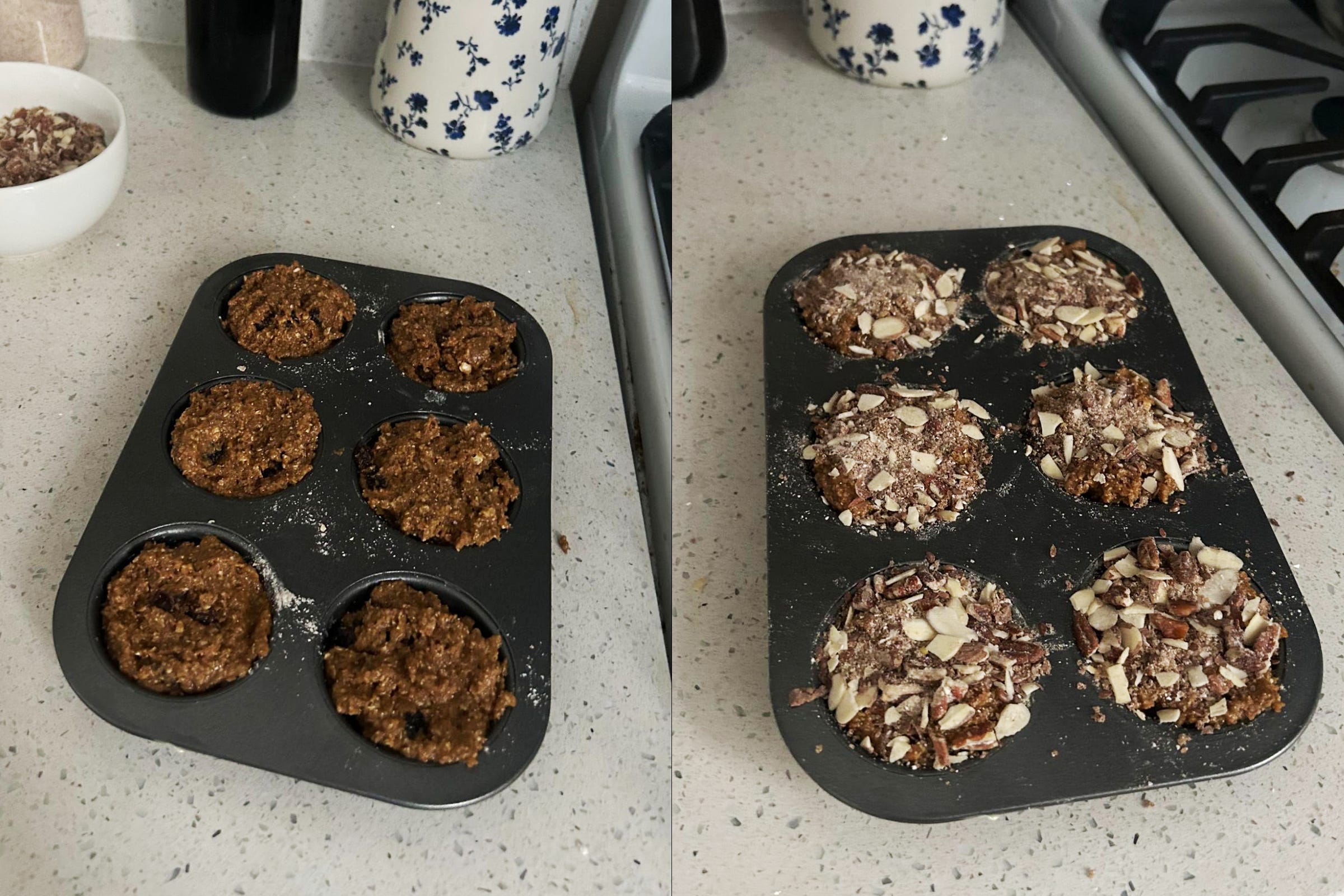 Fill tins to the top with mixture and add topping mixture.