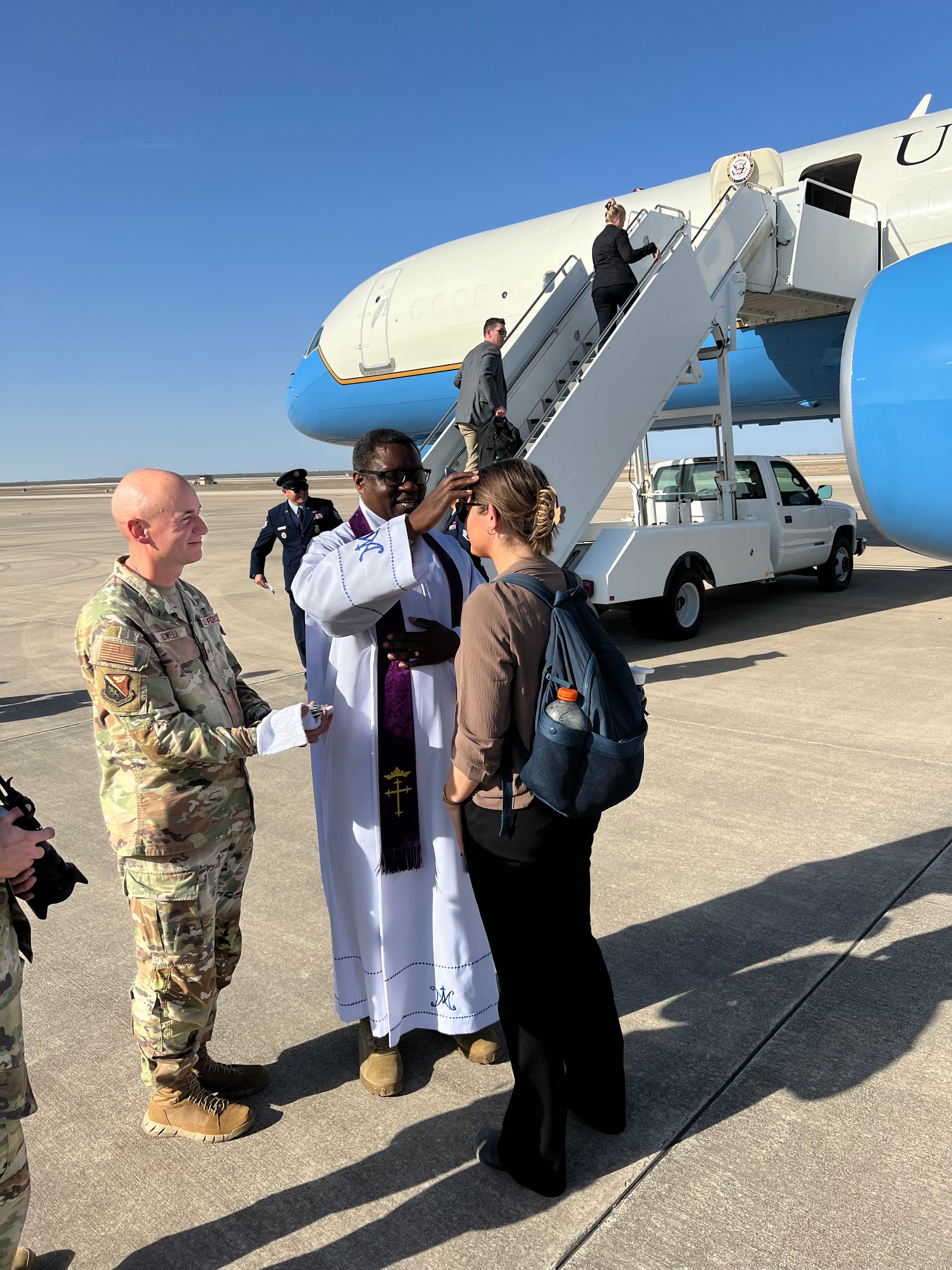 As we were leaving the Eagle Pass and approaching Air Force Two, I realized there was a priest standing at the foot of the plane to give Vance his ashes.