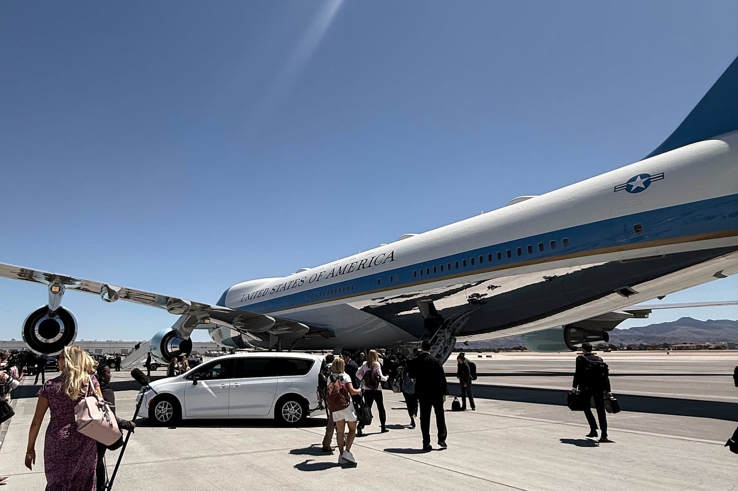 The problem: those of us traveling with him were already at the airport, having cleared the hours-long security process required before boarding. We watched the presser from our phones while waiting under the wing of the plane.