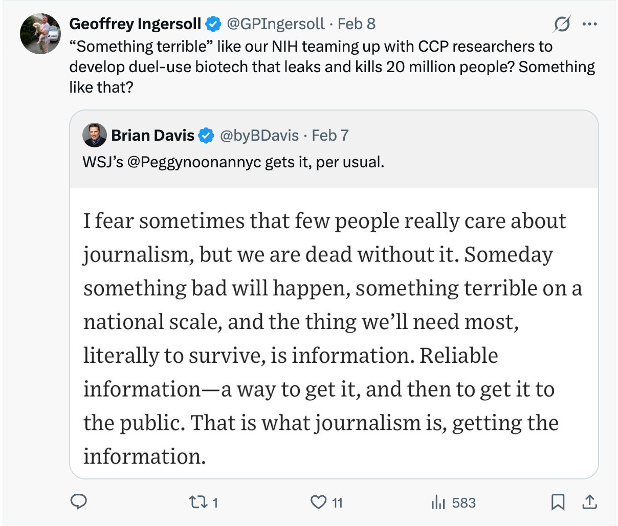 Noonan seems to have forgotten that it was a corrupt establishment’s hold over the media that in some ways contributed to the deaths of 20 million people. How much learning loss among kids happened because the media was dishonest? How many vaccine injuries? How much delay in investigating the actual cause of the virus, who funded it (Fauci), and how it happened?