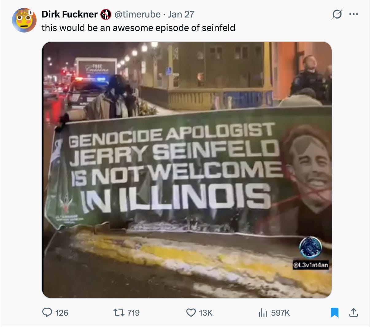 Jerry Seinfeld, a universally beloved comic and apparently the only normal person left in Hollywood, is “no longer welcome in Illinois” because he won’t wear a keffiyeh and shout pro-Hamas slogans. Also because he’s Jewish.