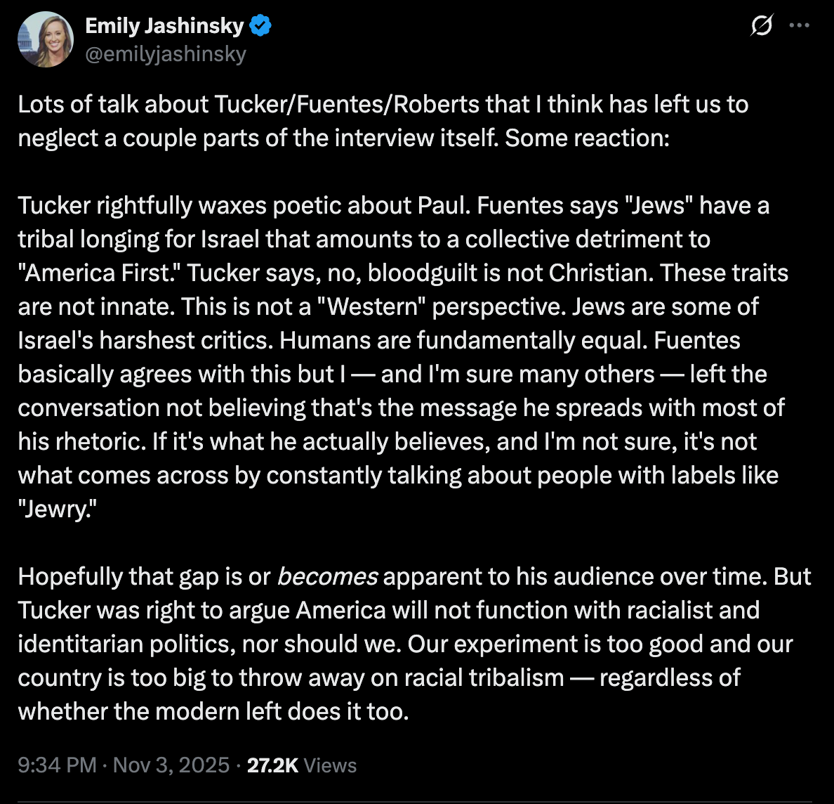 One bit that went unnoticed by the frothing mania following the interview is how often Tucker attempted to intellectually inoculate Fuentes’s thoughts on Jews, specifically in biblical terms.