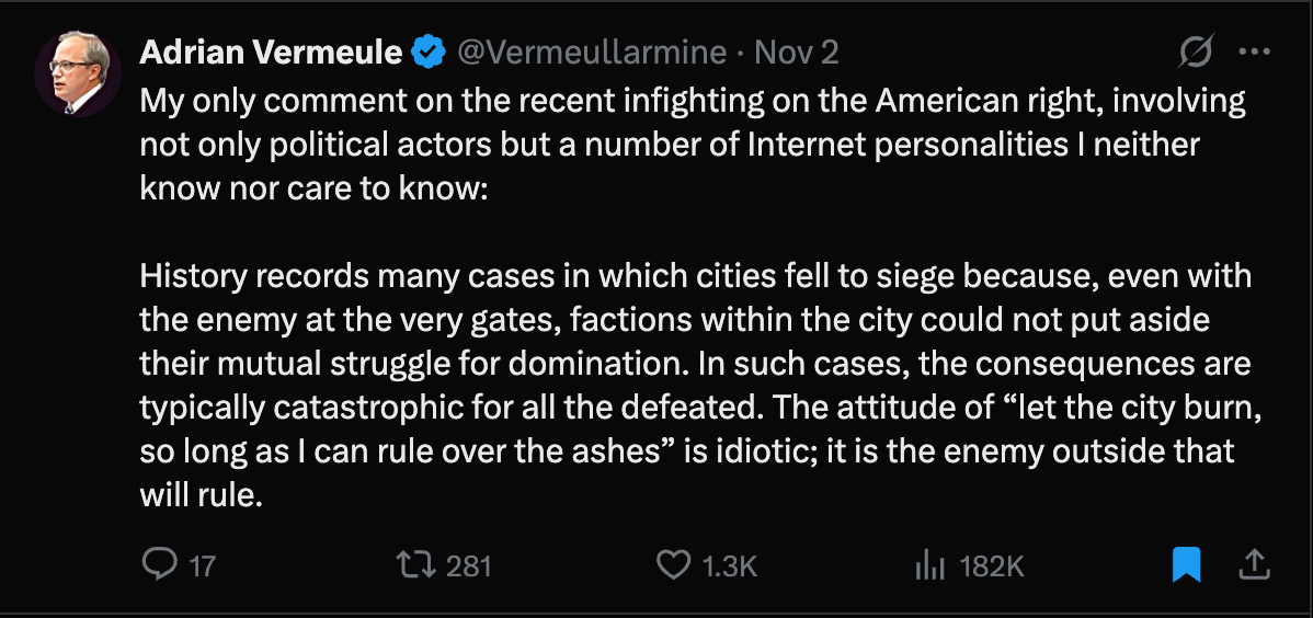 As we consider the factional spat that’s wracked conservatives this week, I think this tweet from Adrian Vermeule is relevant.