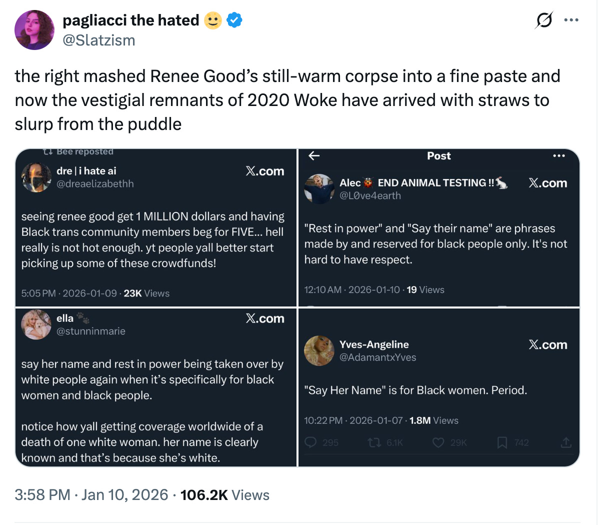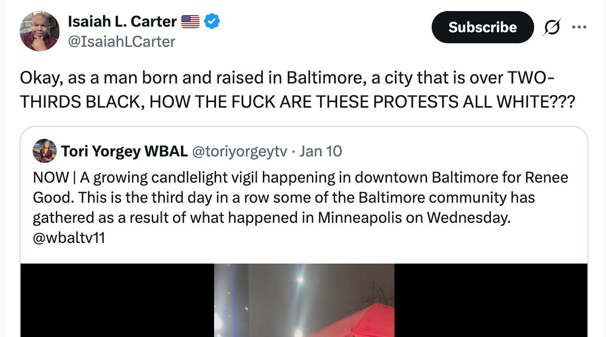 They stayed home to make TikToks about how nobody should remember Renee Good’s name. There are countless hours of them saying exactly that. Remembering the names of women killed in the leftist movement is a black thing, foolish whitey. Remembering Renee would be appropriation (and racist).