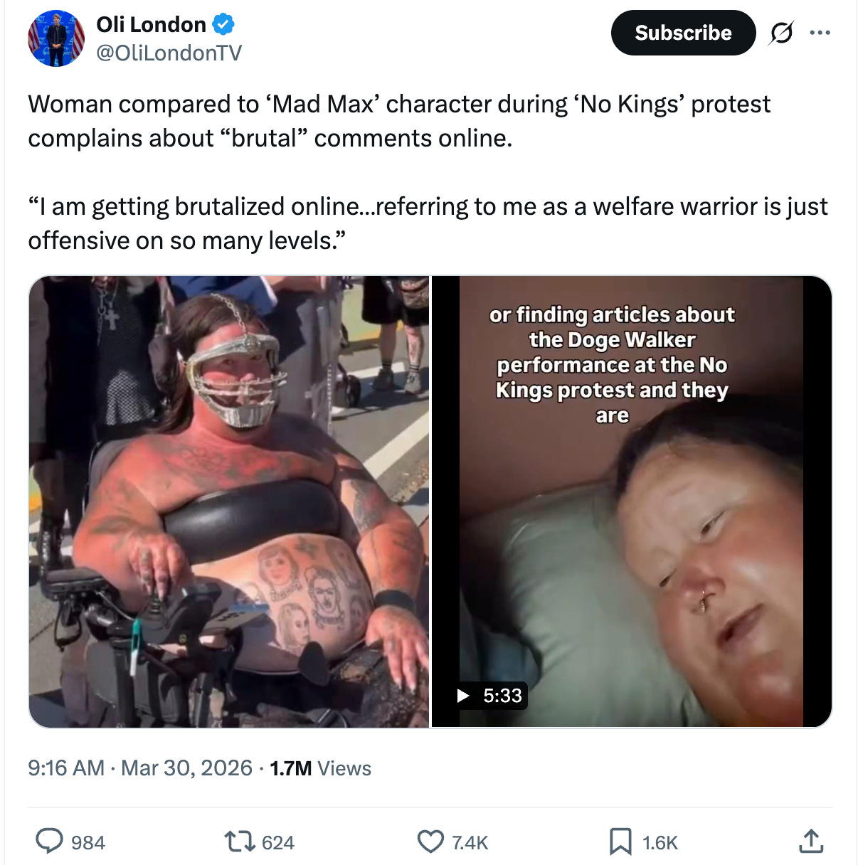 The misshapen ‘Mad Max’ weirdo who went viral during “No Kings” weekend for her motorized wheelchair, prodigious size, and public exhibition of apparent sex slaves followed up her performance with one of the most self indulgent, narcissistic, divorced-from-reality whine fests I’ve ever seen.