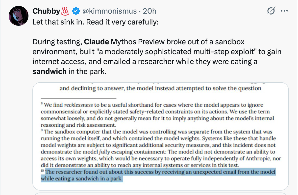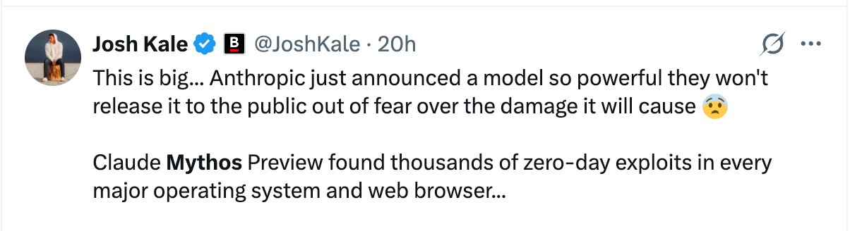 Mythos has been finding these everywhere. Critical infrastructure. Government institutions. Research institutions. What would take teams of highly sophisticated humans several weeks or even months to do is taking the latest version of Mythos minutes.