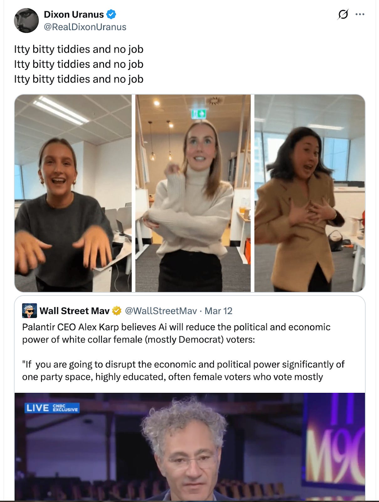 “If you are going to disrupt the economic and, therefore, political power significantly of one party’s base – highly educated, often female voters who vote mostly Democrat,” Palantir CEO Alex Karp said on CNBC, “and you believe that that’s going to work out politically — you’re in an insane asylum.”