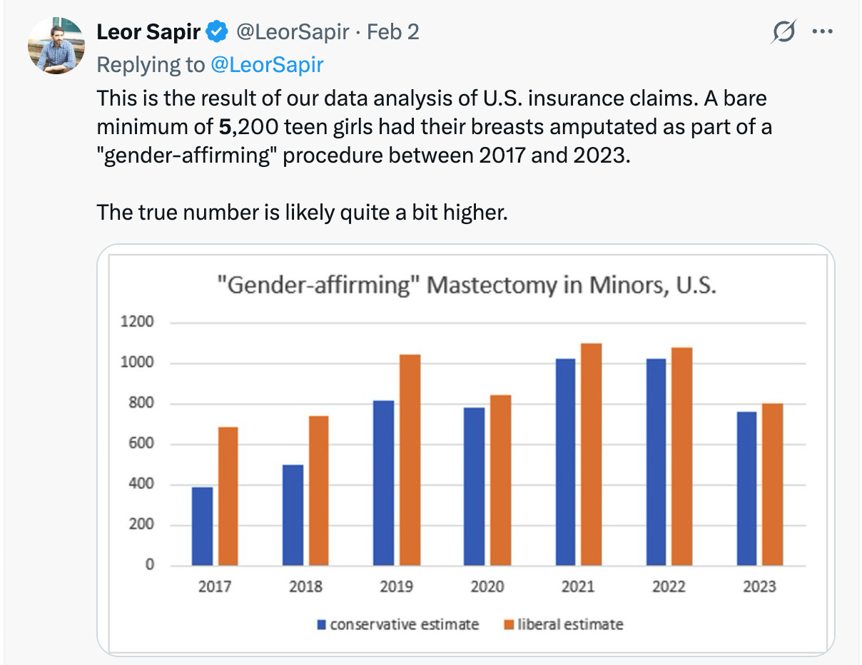 Leor Sapir, who has been tracking sex changes for minors for years, estimates that more than 5,000 young girls will never breastfeed their children, if they can even have them now.