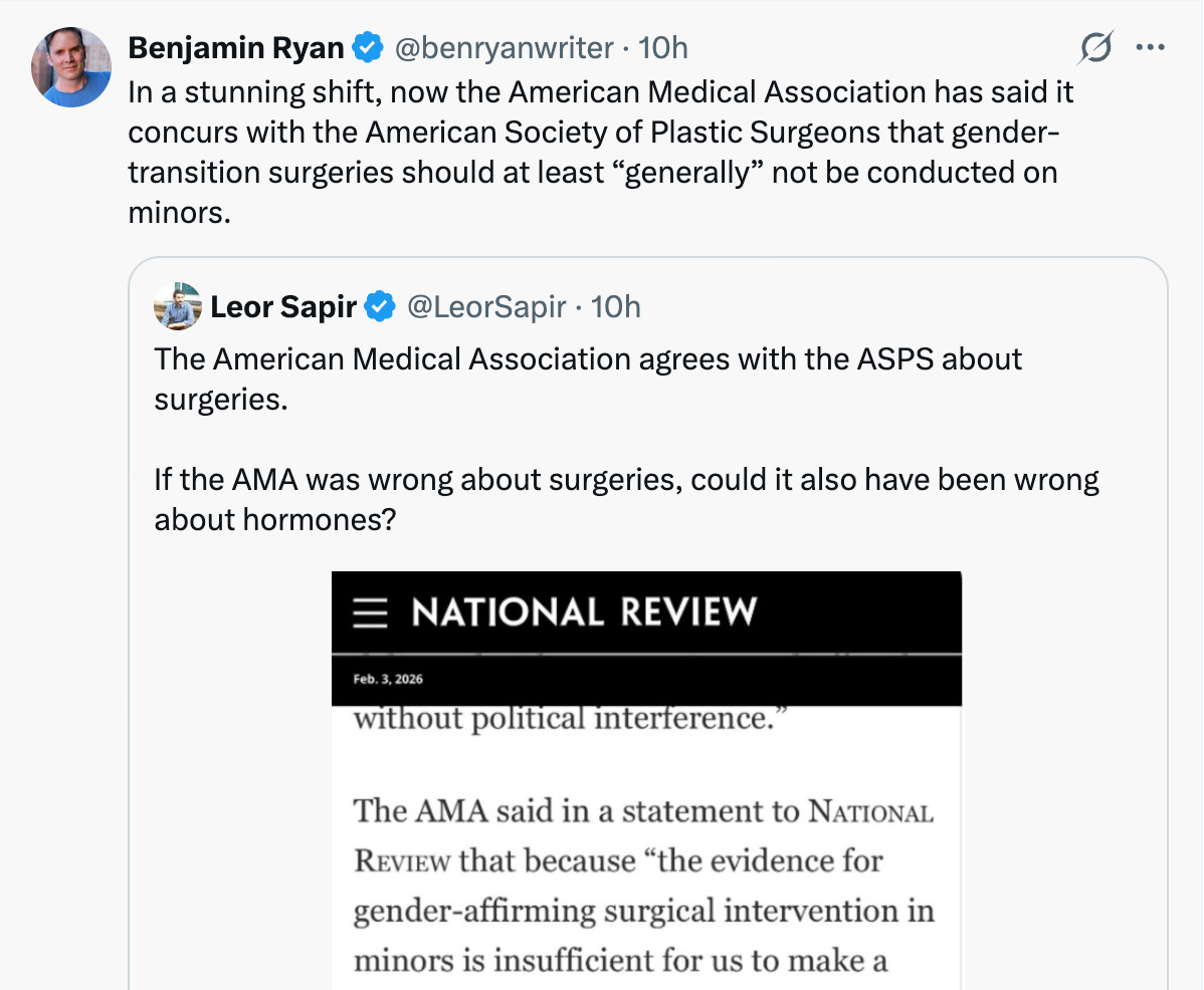We’re now thankfully rolling back a lot of these policies. The American Medical Association recently caved and said surgeons should “generally” stop mutilating confused children.