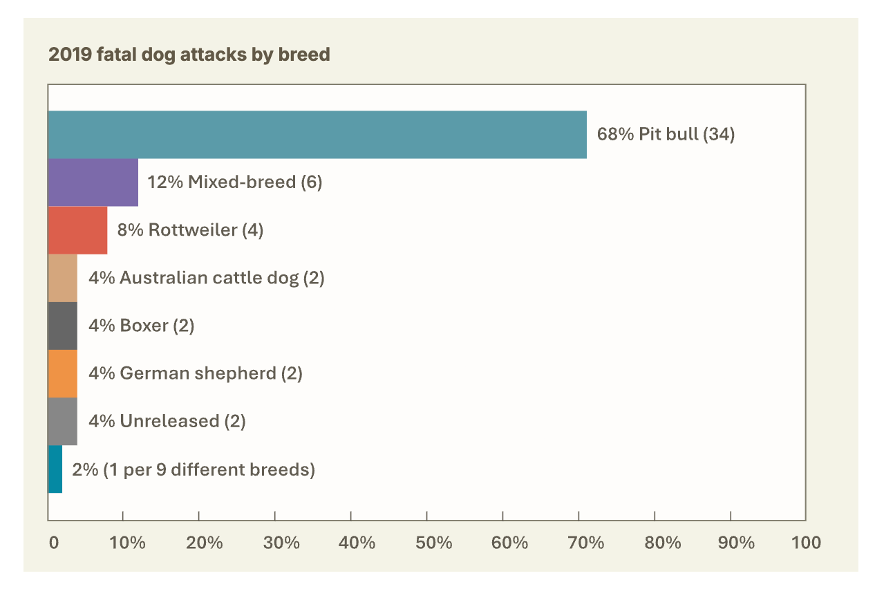 DogsBite.org analyzed self-reported dog bite incidents collected by New York City’s Department of Health and Mental Hygiene (DOHMH) between Jan. 1, 2015 and Dec. 31, 2023. There were 29,992 total incidents. Dog breed was recorded in 76% of these cases, though I have doubts about the public’s ability to recognize pit bull mixes (You can test your own skill with this game made by Crémieux).