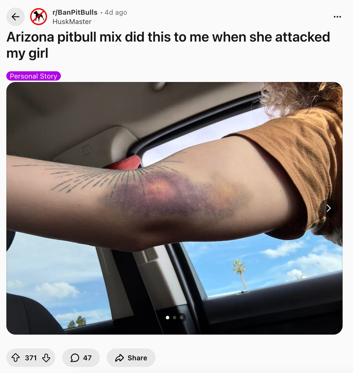 Though Reddit saw fit to banish r/fatpeoplehate, the subreddit r/BanPitbulls is still live, with 130,000 members to date. Here, common genres of post include: News clippings of pit bulls killing/mauling people or other dogs (seemingly unprovoked), advice for users with loved ones who own aggressive pit bulls, and photos like this, which I warn you, are brutal.