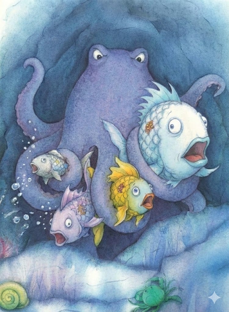 Rainbow Fish is perturbed and seeks guidance from an oracle-like octopus lurking in a dark cave.