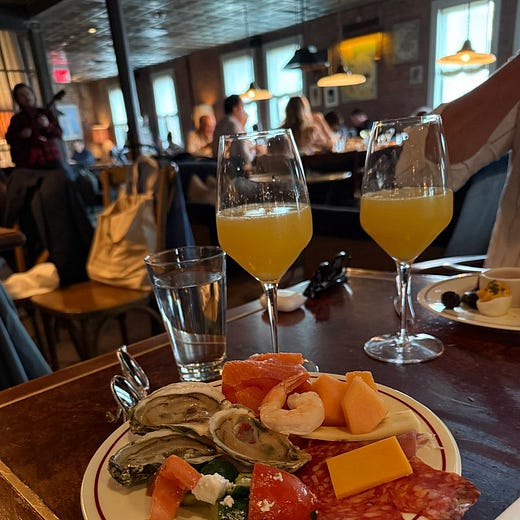 Manhattan Guy attached two images to his post. The first: A line of people standing outside St Joseph’s Church in Greenwich Village. The second: A frankly upsetting jumble of oysters, greek salad, shrimp making direct contact with sliced cantaloupe, some salami, and cheese. It reminded me of that picture designed to simulate what having a stroke is like.