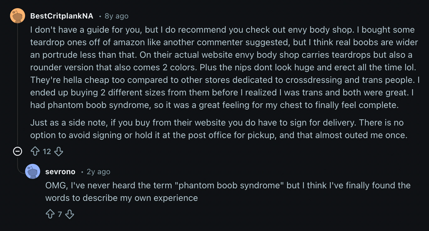 Note the absurdity here. A lot of people in these threads have undergone self-mutilating mastectomy surgery, but they feel this “phantom boob syndrome,” which is apparently when a biological female slices off breast tissue, and her body does a double-take and goes, This shit ain’t feeling right, and so her body sends signals like itching and tingling around the flesh craters to indicate that something ain’t right, and, of course, something really ain’t right, because humans aren’t supposed to cut off natural parts of their body for fetishistic purposes. To deal with this, they wear fake boobs.