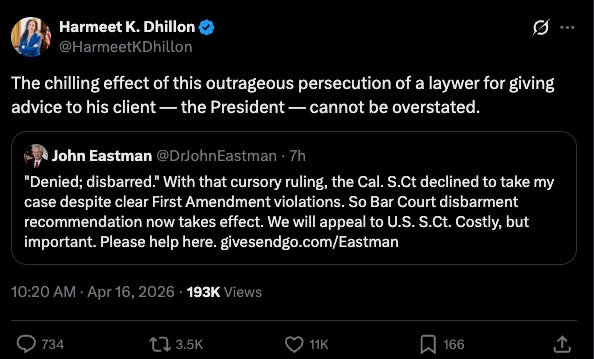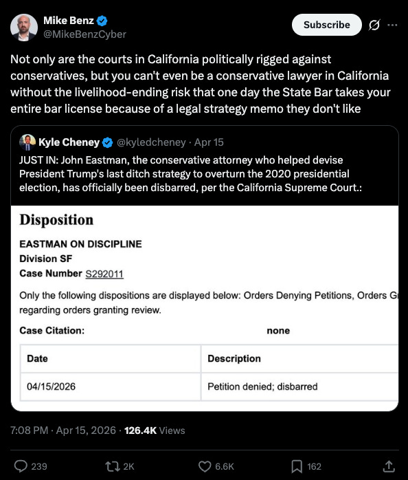 The California Supreme Court disbarred attorney John Eastman on Wednesday. Eastman acted with loyalty, competence, and zeal on behalf of his client (in my view).